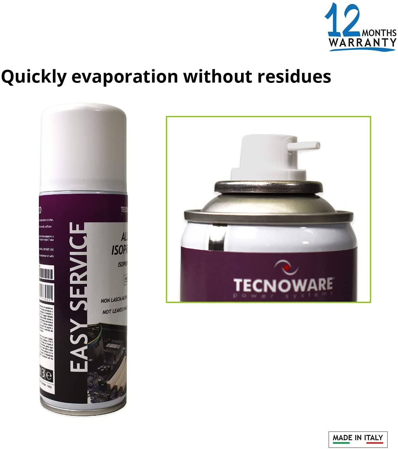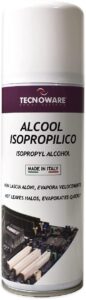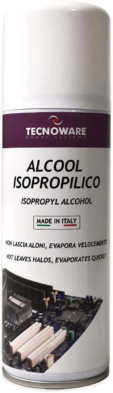 Tecnoware Power Systems Alcool Isopropilico. Spray ad azione rapida per la pulizia di schede elettroniche, tamburi al selenio, testine ink jet, mouse, tastiere, piani di lavoro, circuiti elettronici non sotto tensione. Evapora velocemente e non lascia aloni. Ottimo per la pulizia di: schede elettroniche, testine ink jet, mouse, tastiere, piani di lavoro, circuiti elettronici. Pulisce: rimuove lo sporco senza danneggiare i dispositivi e le parti elettroniche. Non lascia residui: Evapora velocemente senza lasciare traccia. Facile utilizzo: indirizzare l’erogatore verso l’area da pulire ed esercitare una leggera pressione. Contenuto 200ml. Prodotto Made in Italy.